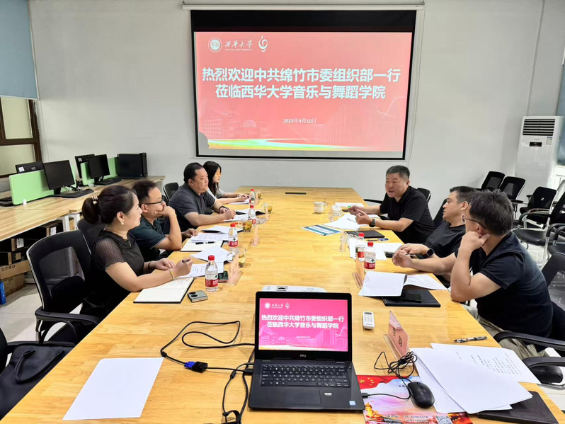 9月10日下午,中共绵竹市委组织部一行赴西华大学音乐与舞蹈学院,就双方战略合作及党支部联学共建活动进行深入交流与洽谈。会议在学院艺C201会议室举行,由音乐与舞蹈学院党委书记曾贤主持,学院院长向琛子、党政办公室主任李韵、音乐系系主任张国仲等共同参会。
